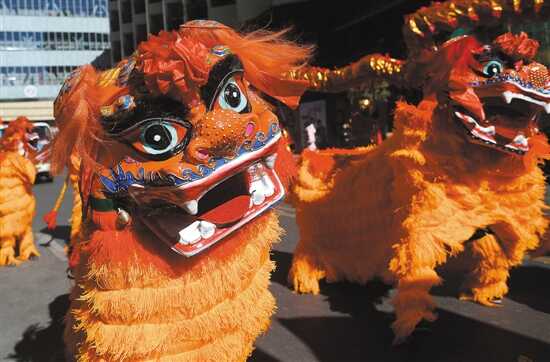 宁夏银川市金凤区举行新春民俗社火大赛,来自各乡镇、街道的参赛队伍,在街头舞狮。 (新华社 王鹏 摄)