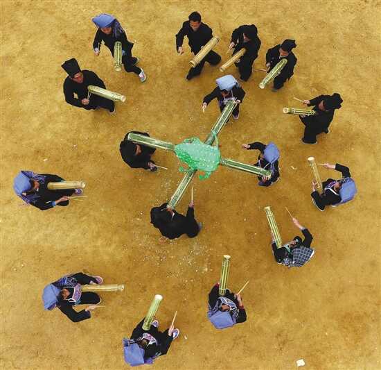 在广西东兰县巴畴乡巴英村,当地群众在一个“蚂拐节”上表演特别的民俗节目,他们抬着供品,敲锣打鼓,跳起“蚂拐”舞,唱着“蚂拐”歌,祈求风调雨顺,五谷丰登。据介绍,“蚂拐”是当地壮族同胞对青蛙的俗称。(新华社 陆波岸 摄)