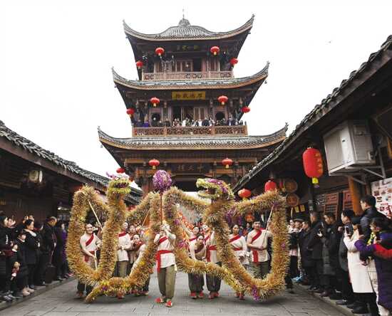 四川阆中古城的一场贺新春活动中,民间艺人在上演舞草龙的特色年俗表演。这条草龙特别之处就在于它是用干草编成,舞动起来颇有难度。(新华社 王玉贵 摄)