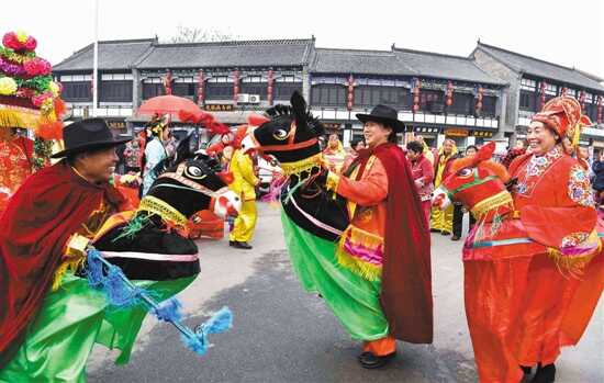 民间艺人在安徽亳州北关历史街区表演“跑驴”。这是当地举办的“民俗踩街闹新春”巡演活动上的一幕。 (新华社 刘勤利 摄)
