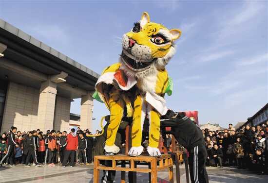 河南温县陈家沟的民俗表演“陈家沟舞虎”让人大开眼界。据说,陈家沟舞虎表演因难度高,曾一度绝迹,好在如今一众年轻人又让它“重现江湖”。(新华社 李安 摄)