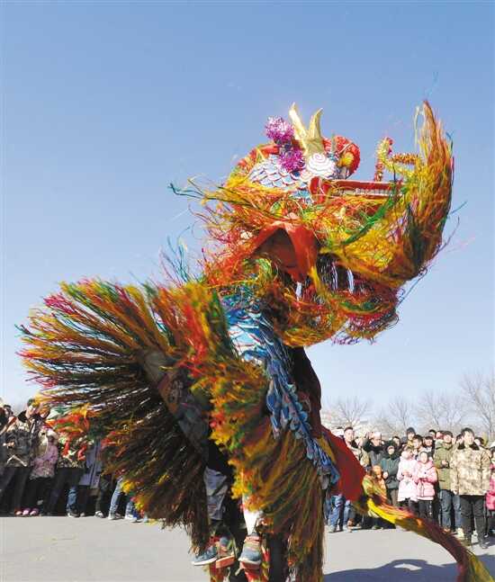 河北省黄骅市的民间艺人在表演麒麟舞庆元宵。(新华社 牟宇摄)