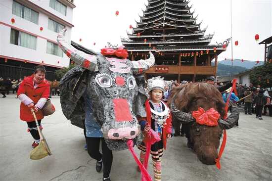 广西龙胜平等镇广南村鼓楼前,侗族同胞在舞“春牛”。这是当地举行的“闹春”活动中的特色节目。 (新华社 石农兵 摄)