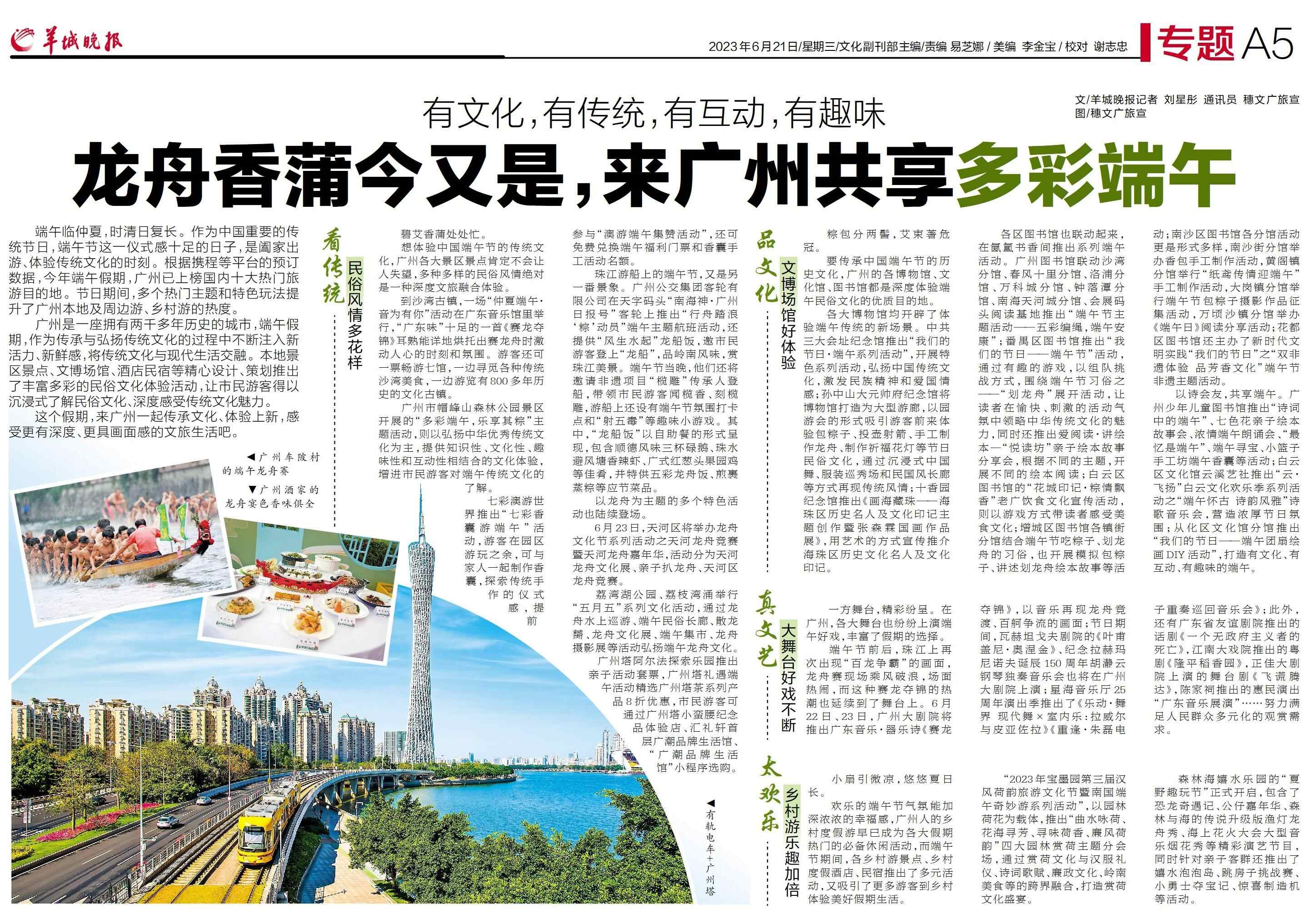 广州是一座拥有两千多年历史的城市,端午假期在传承与弘扬传统文化的过程中不断注入新活力、新鲜感,将传统文化与现代生活交融。本地景区景点、文博场馆、酒店民宿等精心设计、策划推出了丰富多彩的民俗文化体验活动,让市民游客得以沉浸式了解民俗文化、深度感受传统文化魅力。