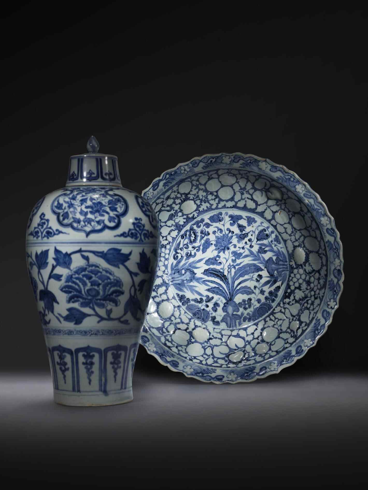 另一件“元 青花芭蕉瓜竹凸花果实纹菱花式大盘”同样罕见,口径逾42厘米,磅薄具气势,更结合了“白地青花”“蓝地白花”及模印等多个装饰技法,因此其烧制难度非常高。被认为供贵族显宦所用,存世量少。