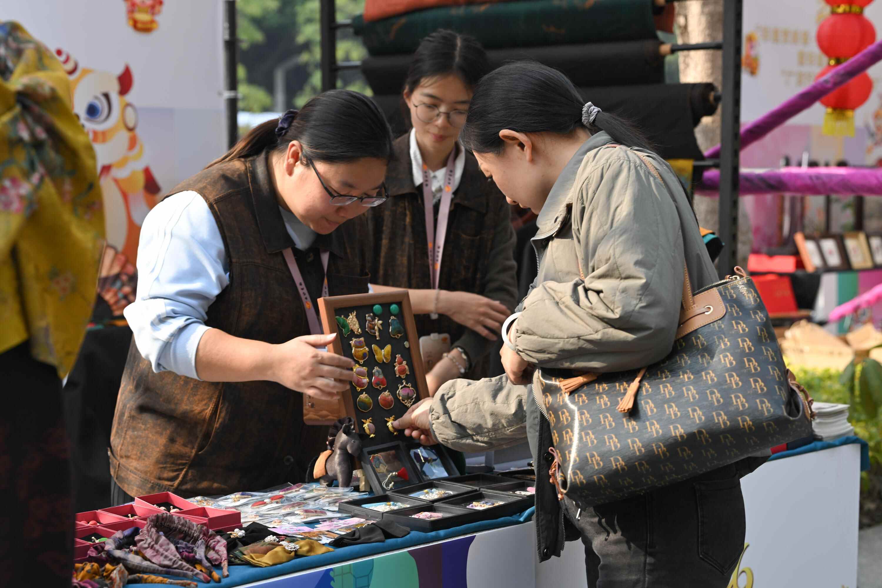 在市集现场,非遗跨界创新产品层出不穷,广绣耳环与胸针、香云纱发卡、广彩冰箱贴、“珠光宝气”的粤剧头饰等让人眼前一亮。启动仪式上,用于点睛的醒狮头产自清远,而当地的醒狮头年销售量高达1.2万套,大多销往海外。