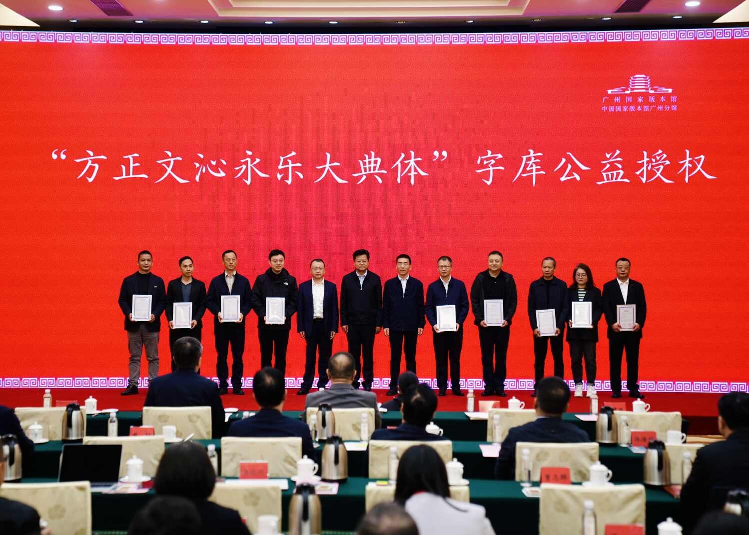 本次发布会上,8家中央媒体、全省各地级市以上市委宣传部、省直宣传文化系统有关单位及港澳媒体等50多家单位成为首批授权单位。广东省委宣传部副部长、广东省新闻出版局(广东省版权局)局长倪谦,广州国家版本馆馆长张伟涛,北京北大方正电子有限公司总裁张建国分别为人民日报社、新华社、南方报业传媒集团(南方日报社)、羊城晚报报业集团(羊城晚报社)、广东广播电视台、香港大公文汇传媒集团、澳门日报有限公司、广东岭南古籍出版社、广州艺术博物院等9家首批授权单位代表颁发字体使用授权证书。