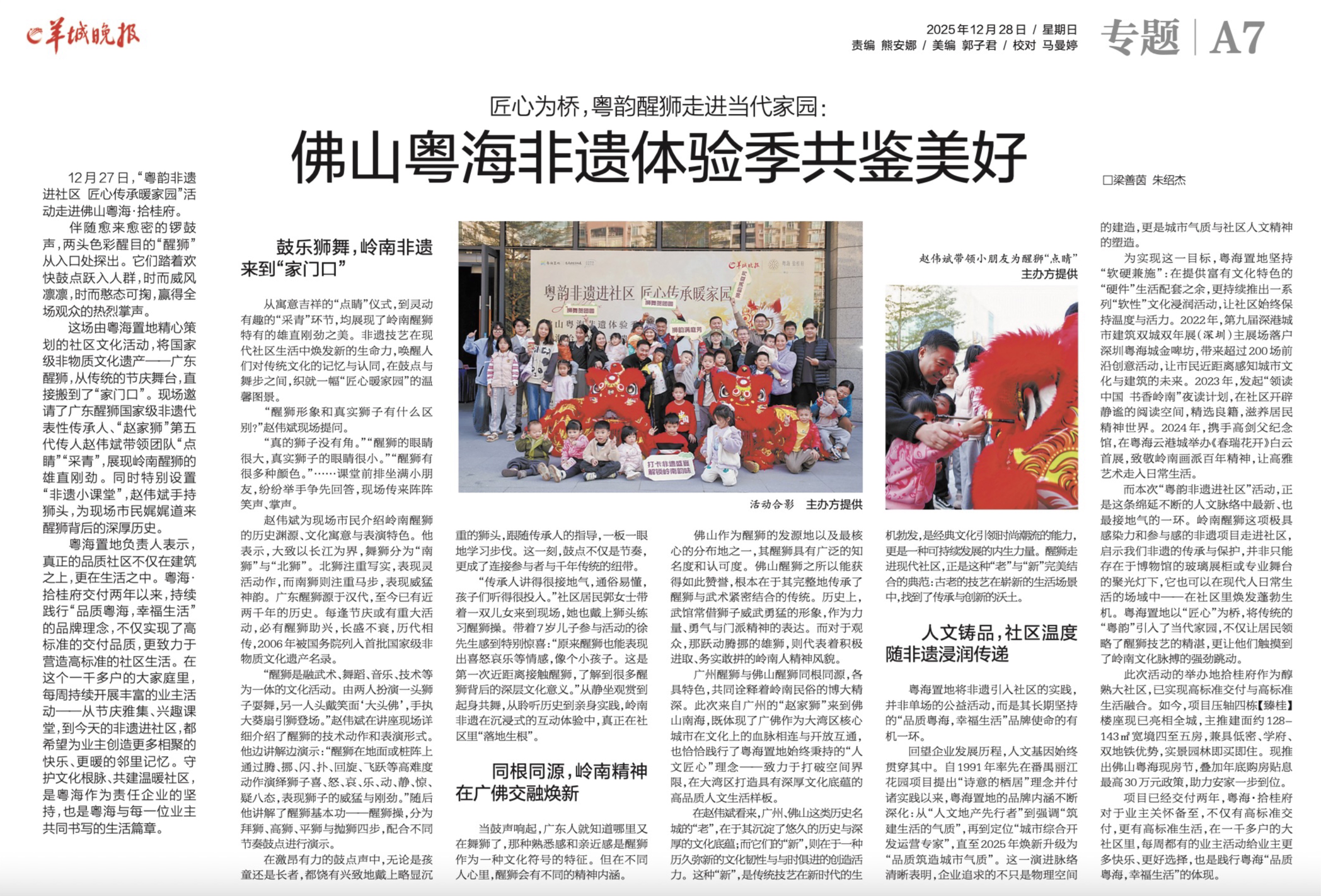 粤海置地以“匠心”为桥,将传统的“粤韵”引入了当代家园,不仅让居民领略了醒狮技艺的精湛,更让他们触摸到了岭南文化脉搏的强劲跳动。