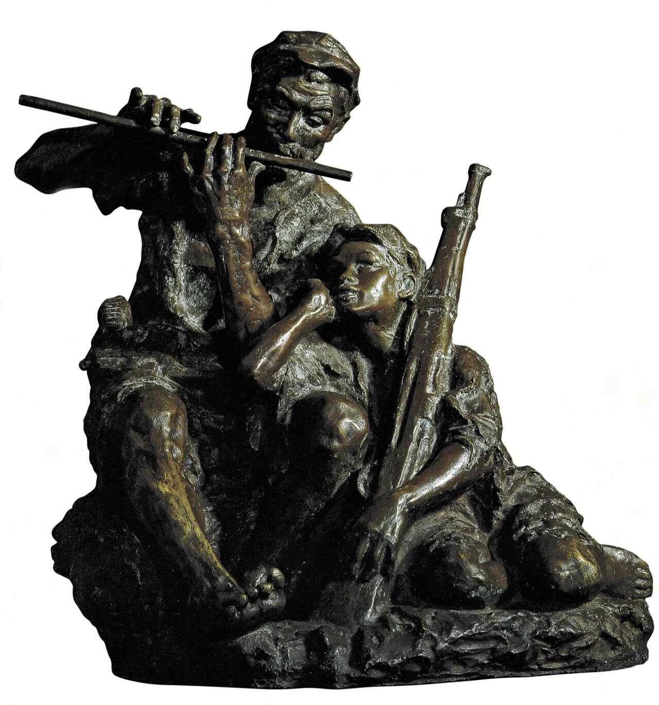 《艰苦岁月》以海南岛琼崖游击队为题材,其革命浪漫主义的手法感动了无数中国人。作品通过老战士吹笛子、小战士扛着长枪依偎在身旁的造型,展现出艰苦年代的革命乐观主义精神。