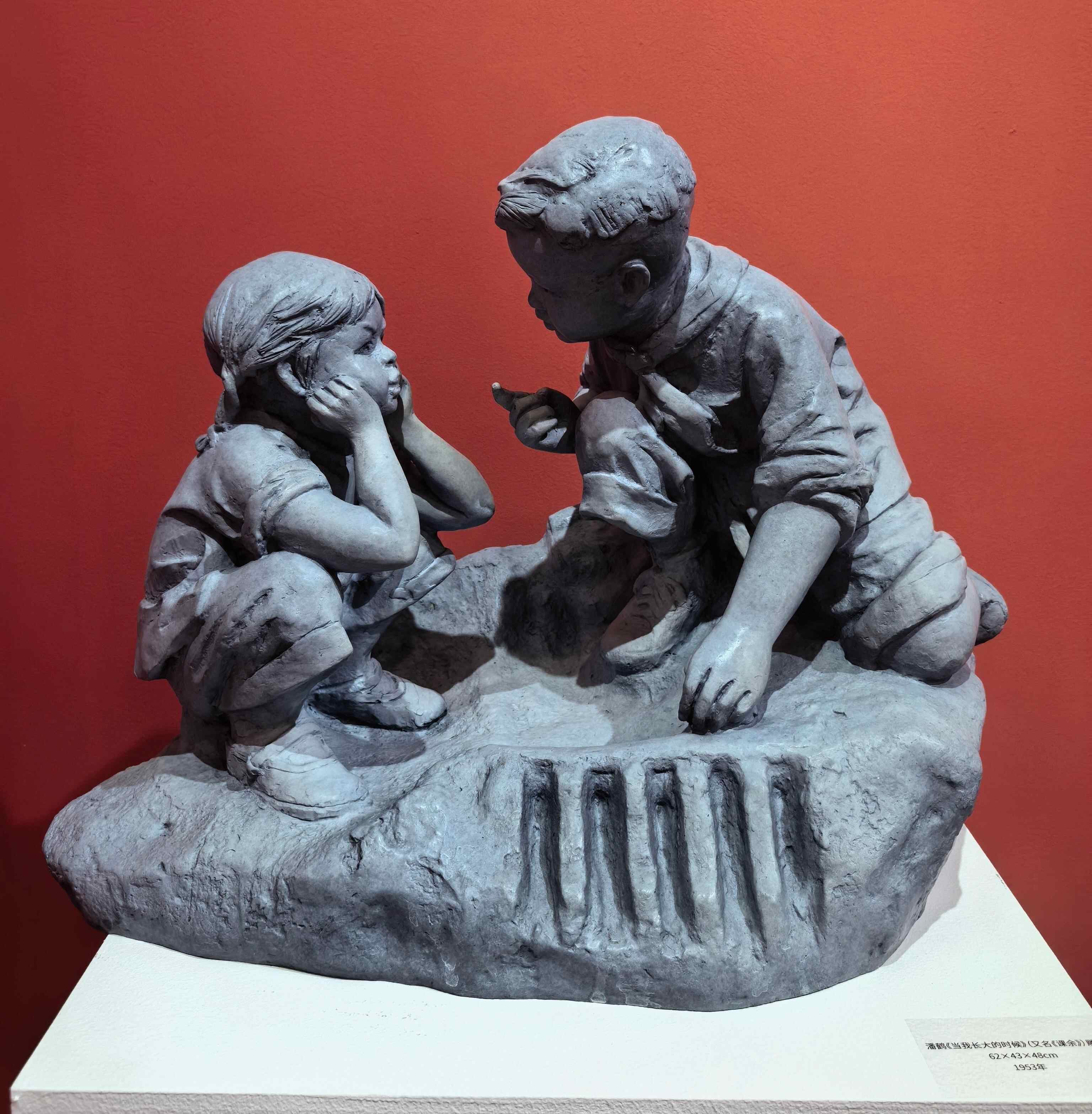 在展厅一角的雕塑《当我长大的时候》,小男孩伸出手指在说,小女孩双手托腮在听。站在这座雕塑前,潘奋回忆道:“父亲最初还塑造了一名弯腰站在两个孩子旁的乡村女教师。而在最终定型的作品中,只保留了小男孩和小女孩,洋溢着平实的童真气息。”
