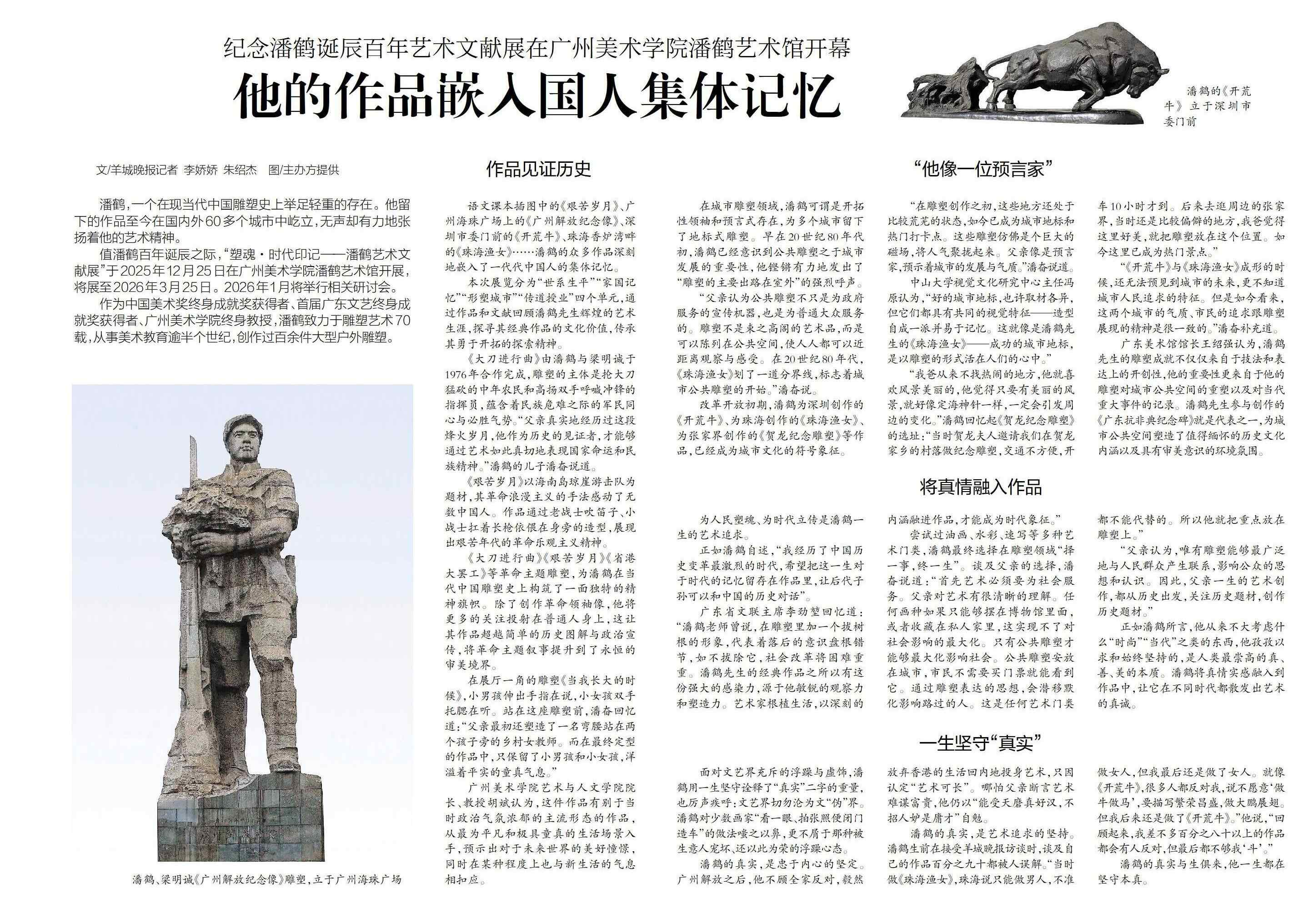 语文课本插图中的《艰苦岁月》、广州海珠广场上的《广州解放纪念像》、深圳市委门前的《开荒牛》、珠海香炉湾畔的《珠海渔女》……潘鹤的众多作品深刻地嵌入了一代代中国人的集体记忆。