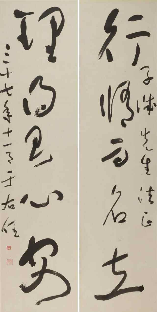 商承祚《篆书八言联》线条瘦硬清雅,结字古朴醇和,展现其深厚的文字学修养。书法作为最具代表性的汉文化载体,融文学、训诂与笔墨技法于一体,形成内容与形式相统一的美学表达。