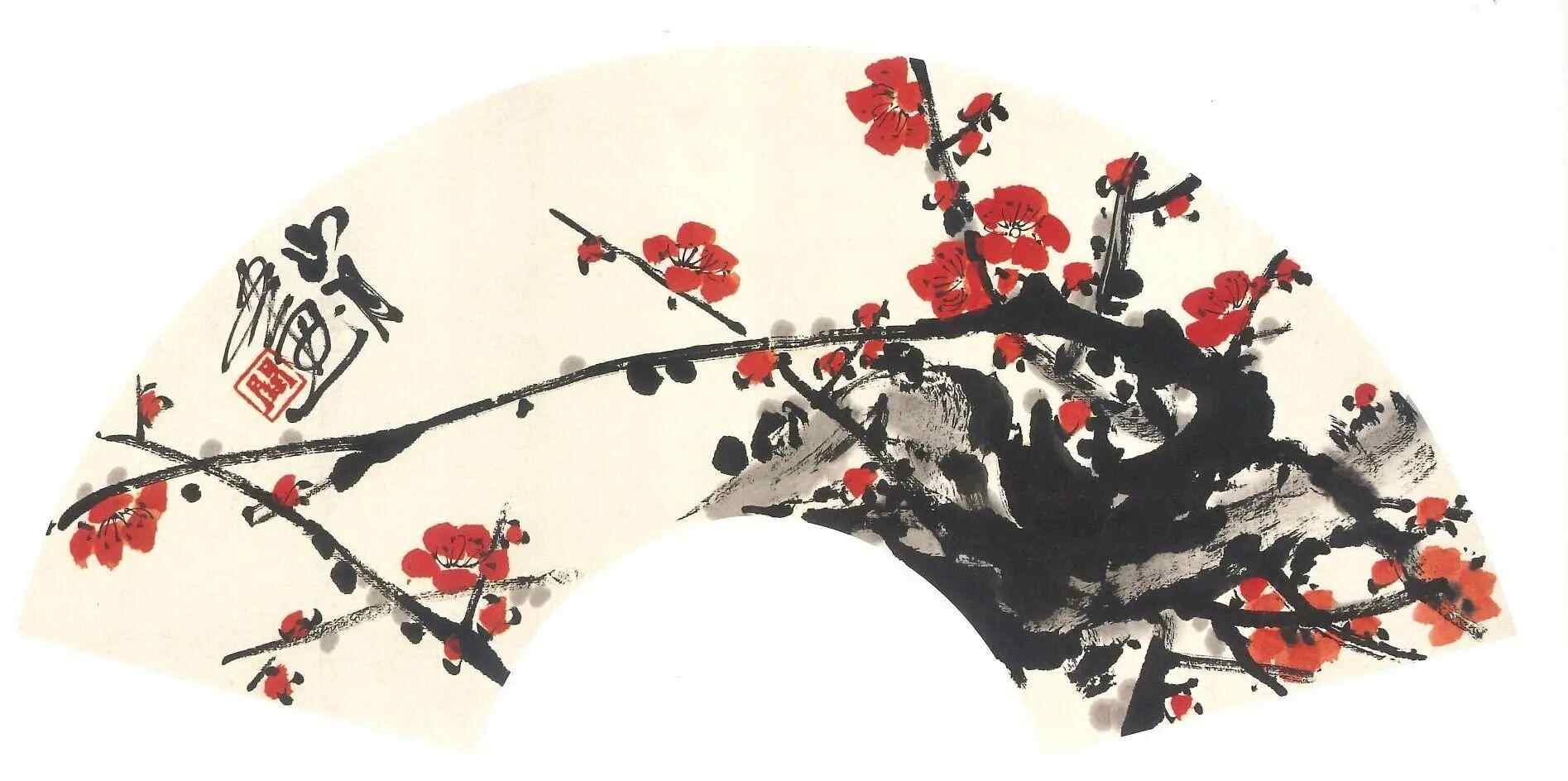 关山月《红梅扇面》以“铁骨红梅”为题,枝干似铁、花色如焰,笔力刚健凝重,既承岭南写实之精微,亦注时代精神于画意。