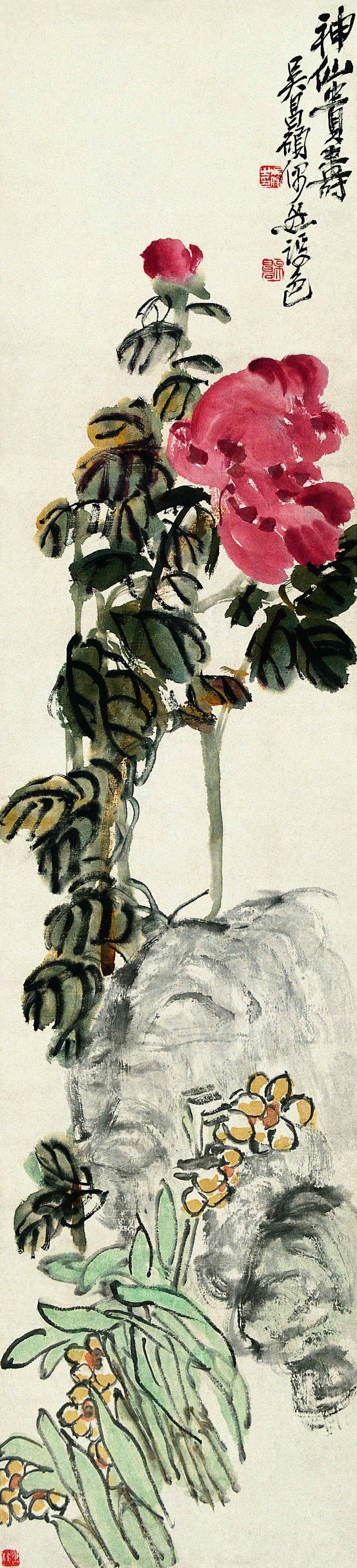 吴昌硕大写意花鸟《神仙贵寿》笔墨苍劲浑厚,设色浓艳醇雅,将金石气韵深植于写意花鸟之中,于富贵吉祥中透出文人风骨。