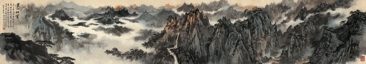 宋文治山水双绝并呈:《西海晴晓》云烟缥缈、峰峦隐现,意境幽远;《黄山松云图卷》则以长卷铺陈黄山胜景,松姿挺拔、云涛涌动,笔墨苍润相济,层次丰赡深远。