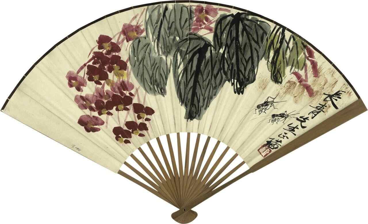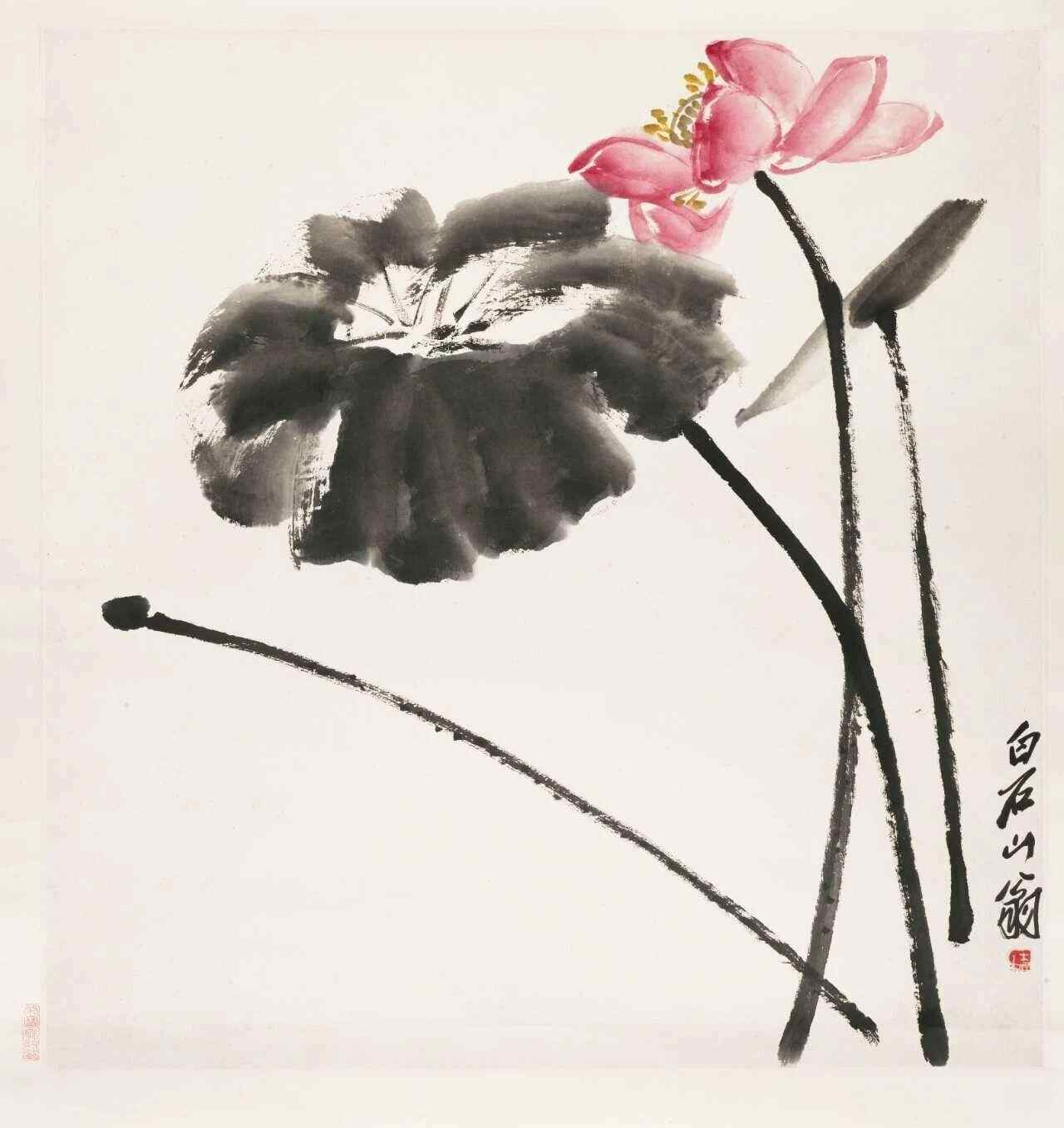 齐白石则双璧同辉——《海棠蟋蟀图扇》中花枝摇曳、草虫生动,笔致细腻如生;《荷花》则以水墨大写意挥洒,荷叶墨气酣畅,荷花清逸脱俗,尽展自然生机。