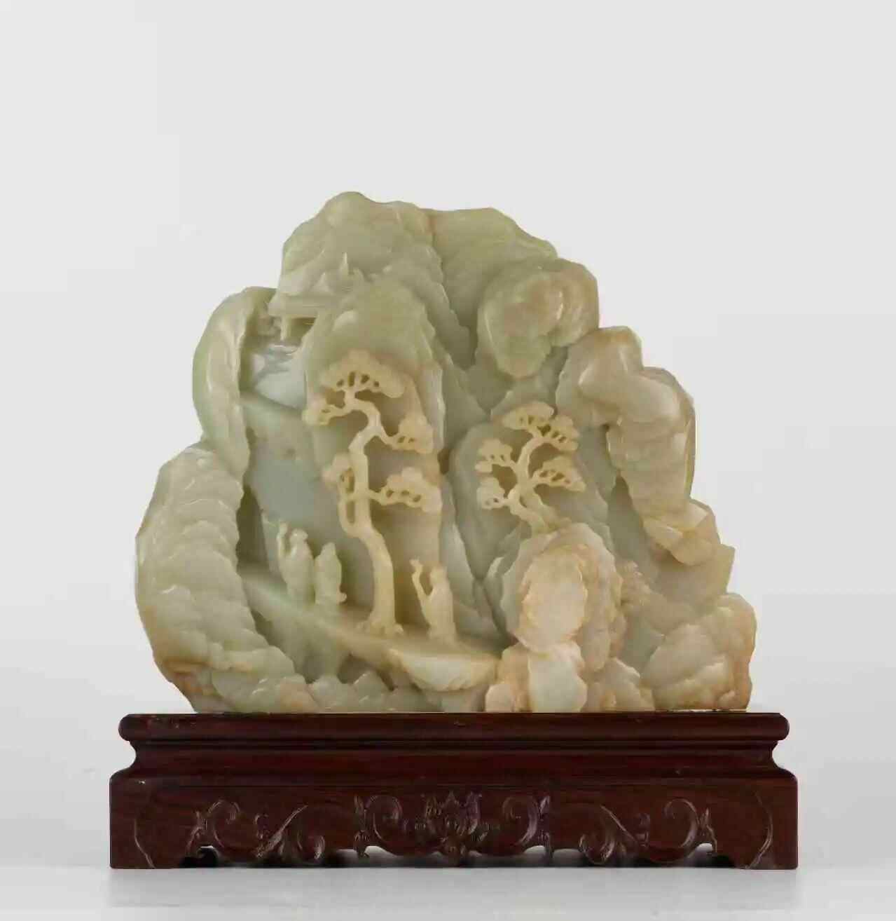 和田玉山水人物纹山子以上等和田玉雕琢而成,玉质温润、结构细腻,以浮雕手法刻画山水楼阁与高士人物,布局疏朗有致,意境清远幽深,兼具赏玩与陈设之雅趣。