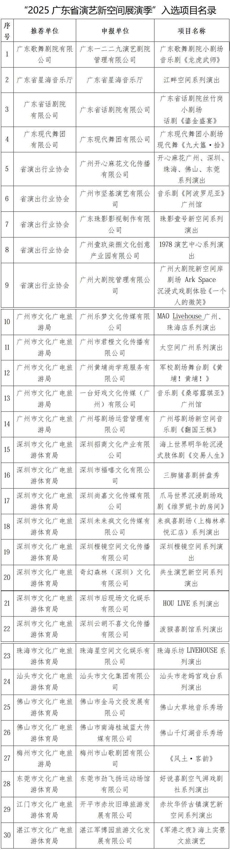 同时,经单位申报、组织推荐、集体评议,综合考虑各申报项目的市场定位、演出规模、内容形式、艺术水准、演艺创新以及与项目周边住宿餐饮、休闲运动、商贸文创等融合程度和消费拉动力度,广东省文化和旅游厅遴选出30个演艺新空间项目纳入此次活动(具体名单附文后)。