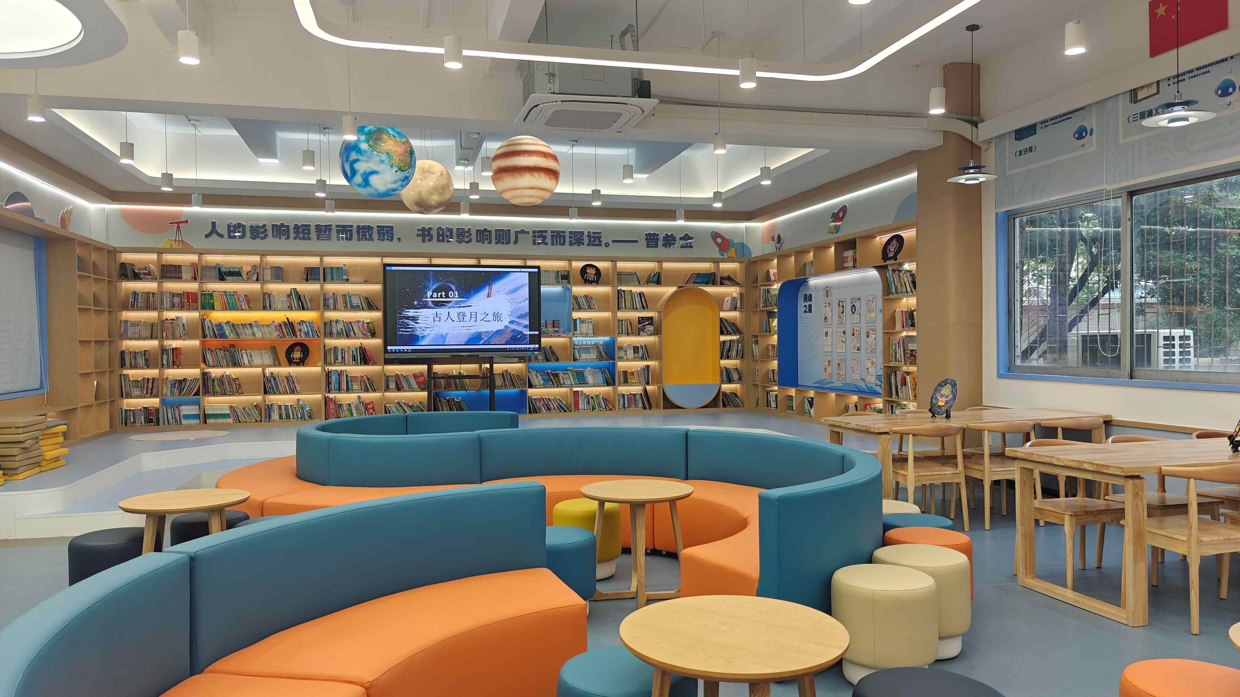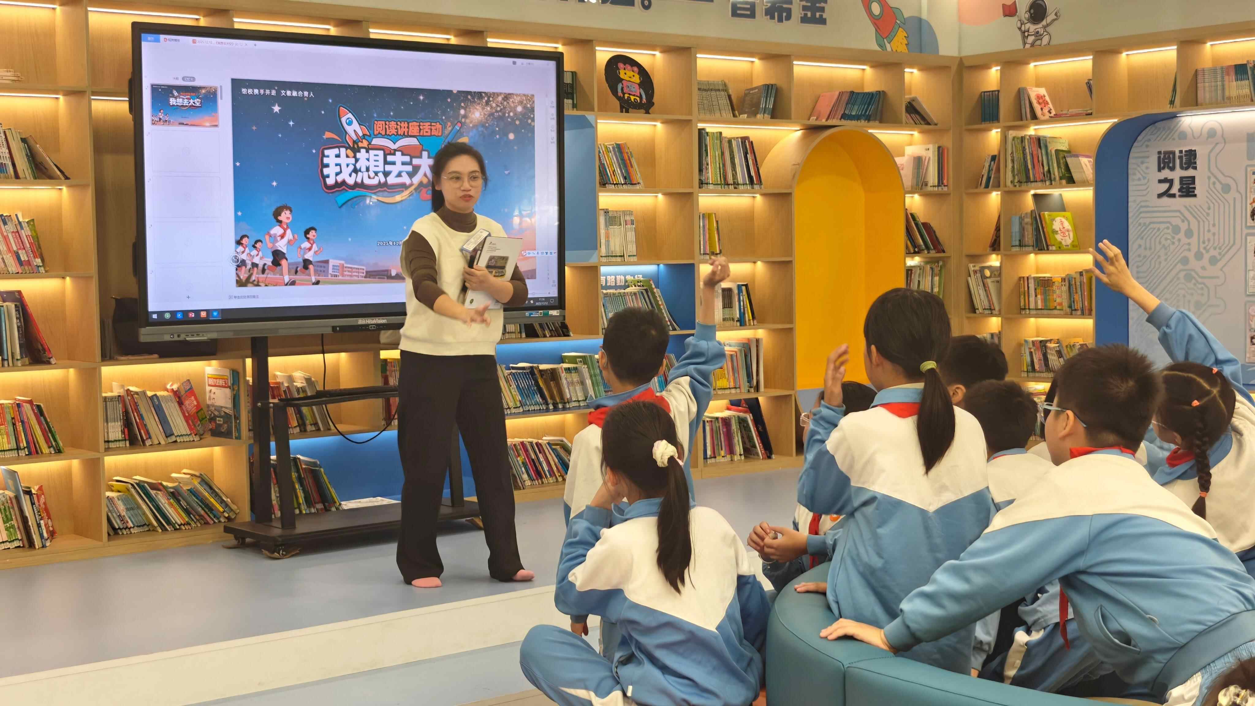 在新启用的校园图书馆里,来自花都区图书馆的文化志愿讲师泳臻老师为学生带来一场生动有趣的绘本阅读课《我想去太空》,让孩子们听得津津有味。“老师,我长大了也想当宇航员。”一位男同学兴奋地举手说道,童言稚语中饱含对未来的憧憬。