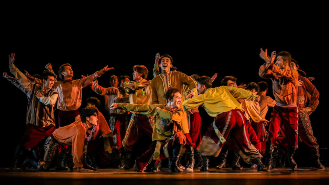 随着刀郎木卡姆音乐响起,台上22名新疆小伙儿迈起激昂舞步,一道暖光照亮他们的面庞,灿烂笑容展现出新疆人民闲适快乐的生活状态。