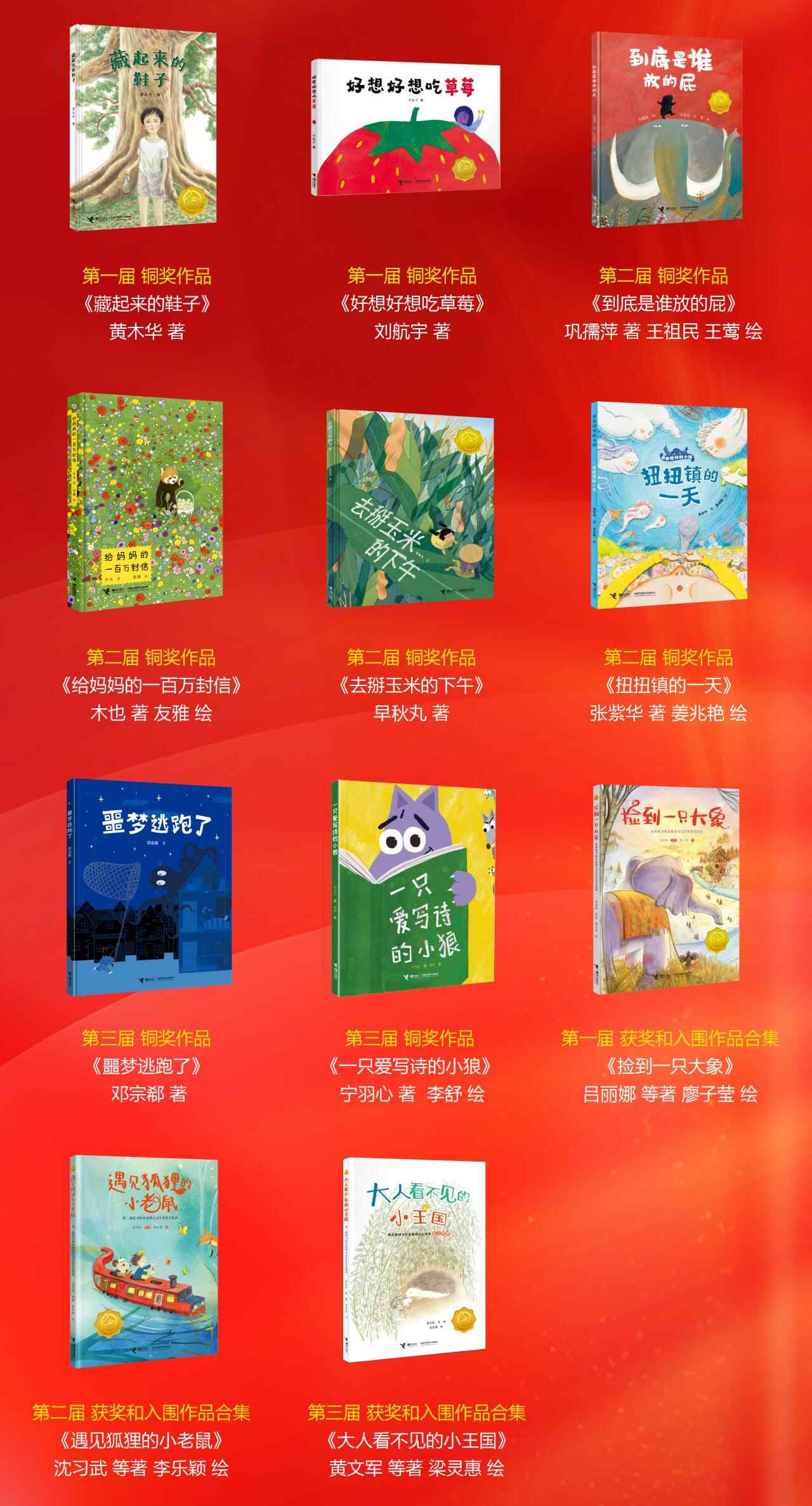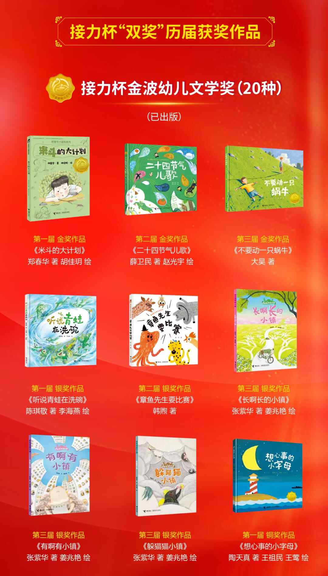 历经三届评选,接力杯“双奖”获奖及入围作品累计出版54种图书,总发行量达156万册,发货码洋5756万元,儿歌《二十四节气儿歌》、图画书《章鱼先生要比赛》、小说《狼洞的外婆》《羊儿在云朵里跑》《假装被风儿吹走了》等21种图书荣获全国优秀儿童文学奖小说奖、金风车国际青年插画家大赛大众选择奖、最佳中华优秀传统文化题材奖、博洛尼亚插画展优胜作品等国内外重要图书奖项。