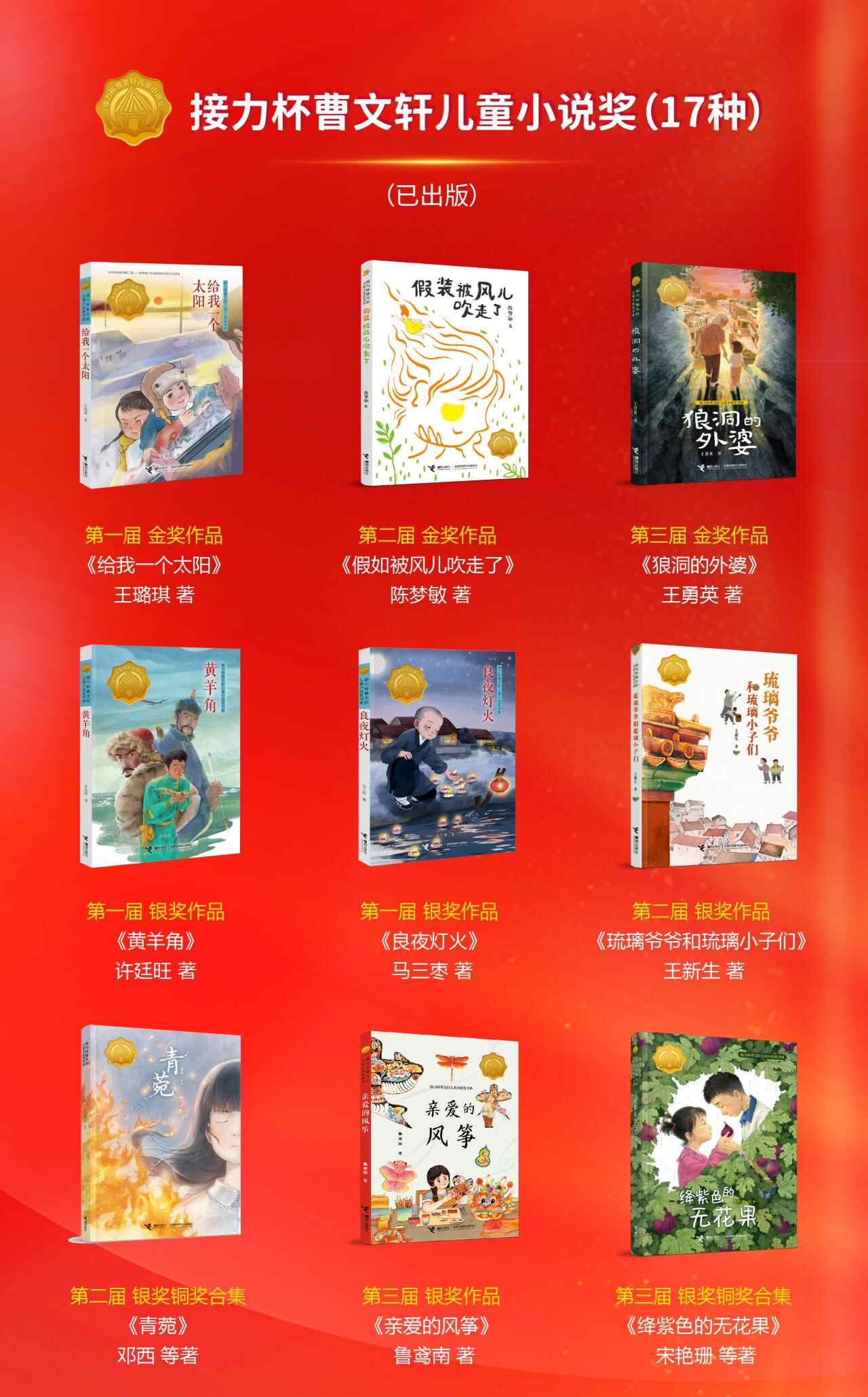 第四届接力杯曹文轩儿童小说奖评出获奖作品9篇(部),分别是:方元创作的《65分母女》(短篇小说)、李长菊创作的《松果的压岁钱》(短篇小说)、李秋沅创作的《多多的上古码头》(中篇小说)、李舒琦创作的《越安的朋友》(短篇小说)、石径创作的《找老虎》(短篇小说)、宋艳珊创作的《小森林》(中篇小说)、甜老虎创作的《大象馆里的猫》(中篇小说)、杨紫汐创作的《窗外长安》(中篇小说)、张逸诗创作的《小圆满》(中篇小说)。(作品顺序按作者姓氏音序排列)
