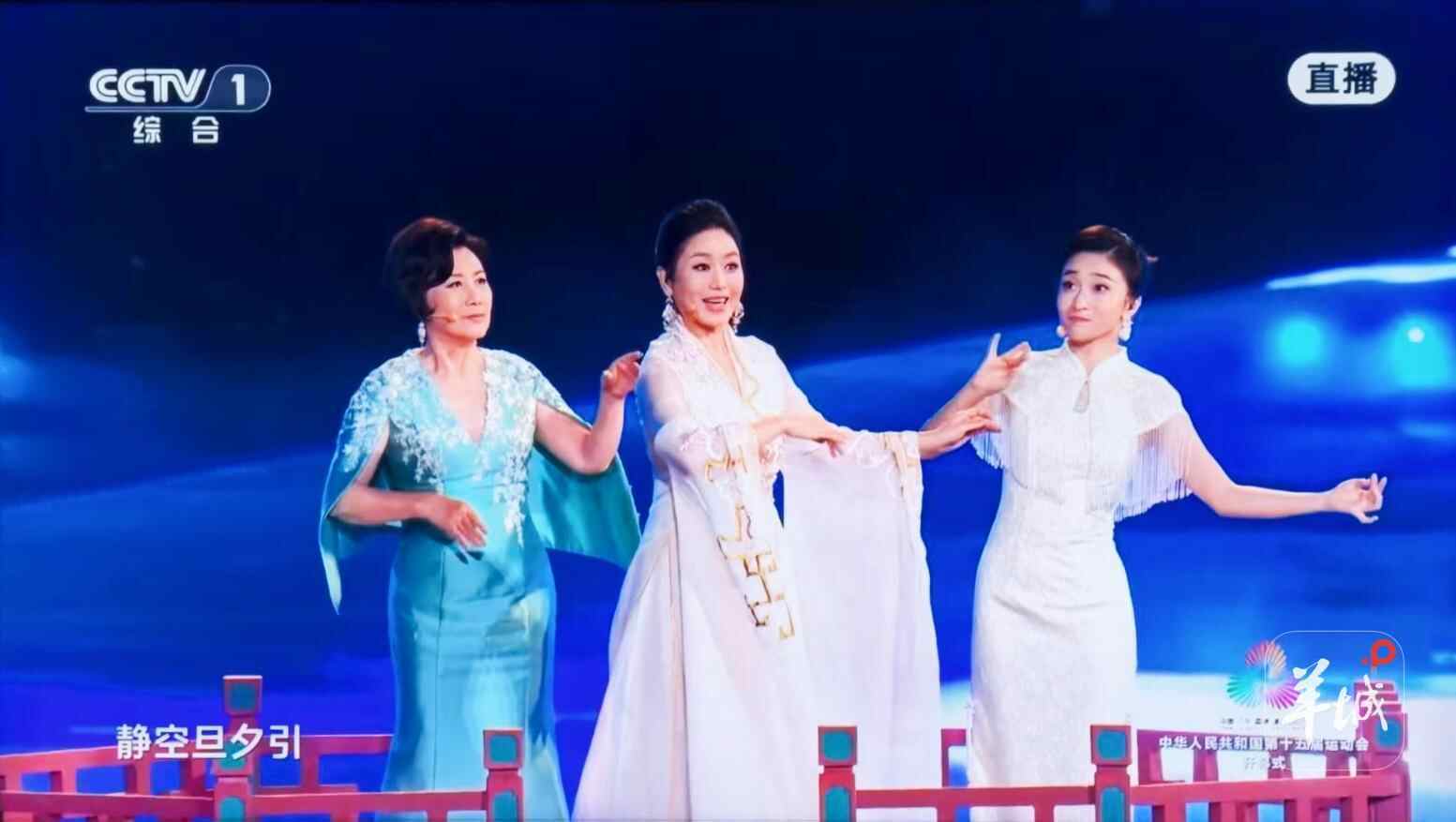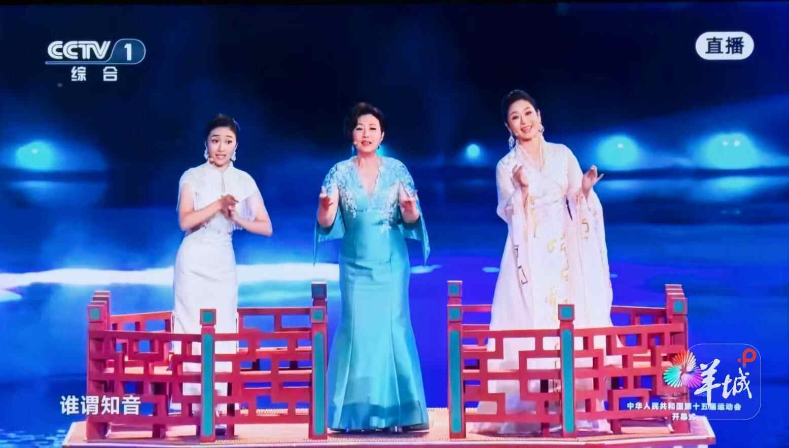 “明月长夜瑞气生,漫天醉妙韵……”粤港澳三地艺术家汪明荃、曾小敏、麦晓柔在开幕式文体展演中表演粤剧音乐作品《彩云追月》,唤起无数观众心底的岭南记忆。