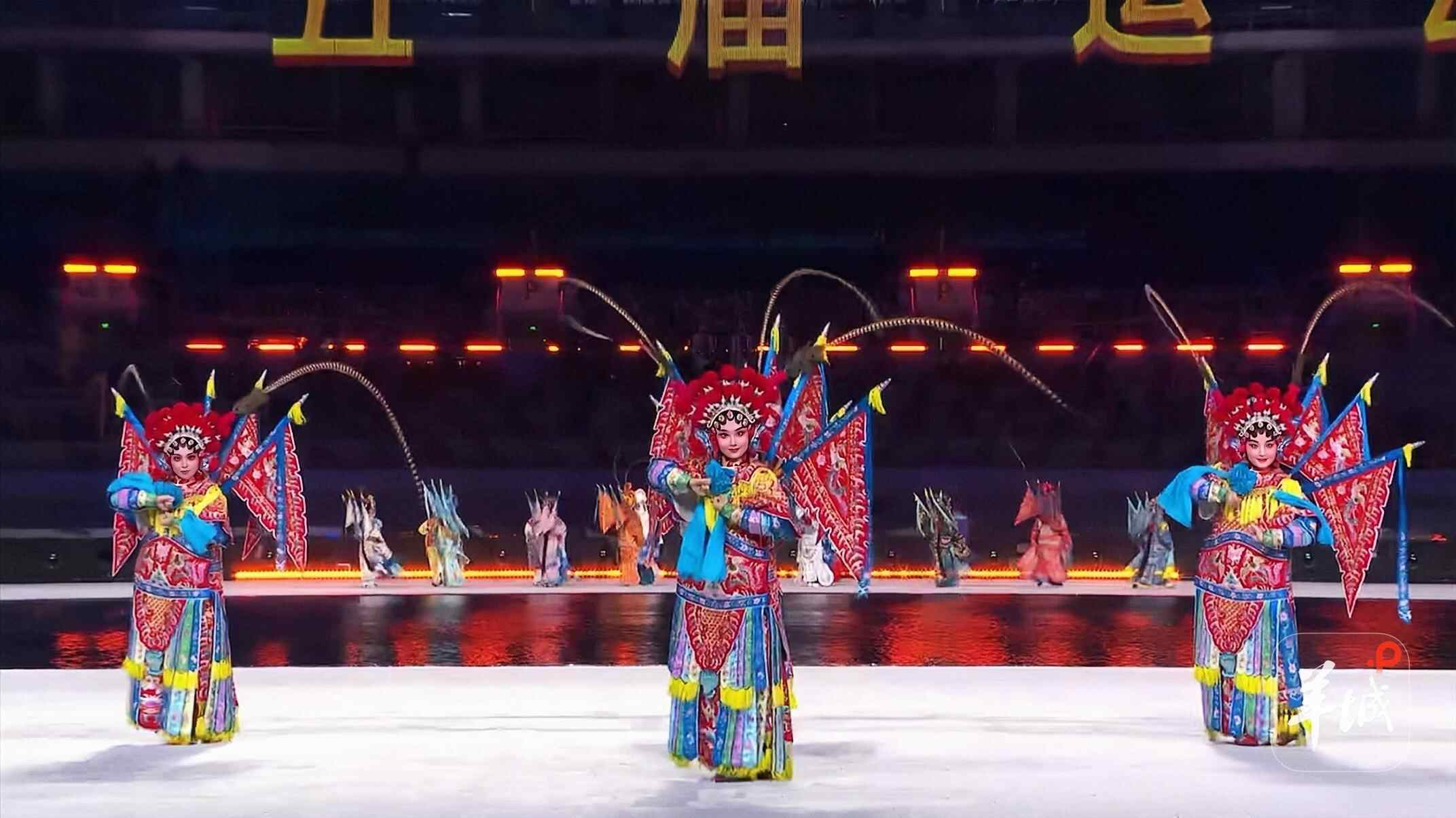 转至开幕式文体展演第二篇章《同心同缘》,演员们迅速完成角色转换,以婉约华美的花旦形象再现岭南戏曲的细腻与深情。水袖轻扬、目若秋水,在动静转换之间,现场表演尽显粤剧刚柔并济的美学品格。
