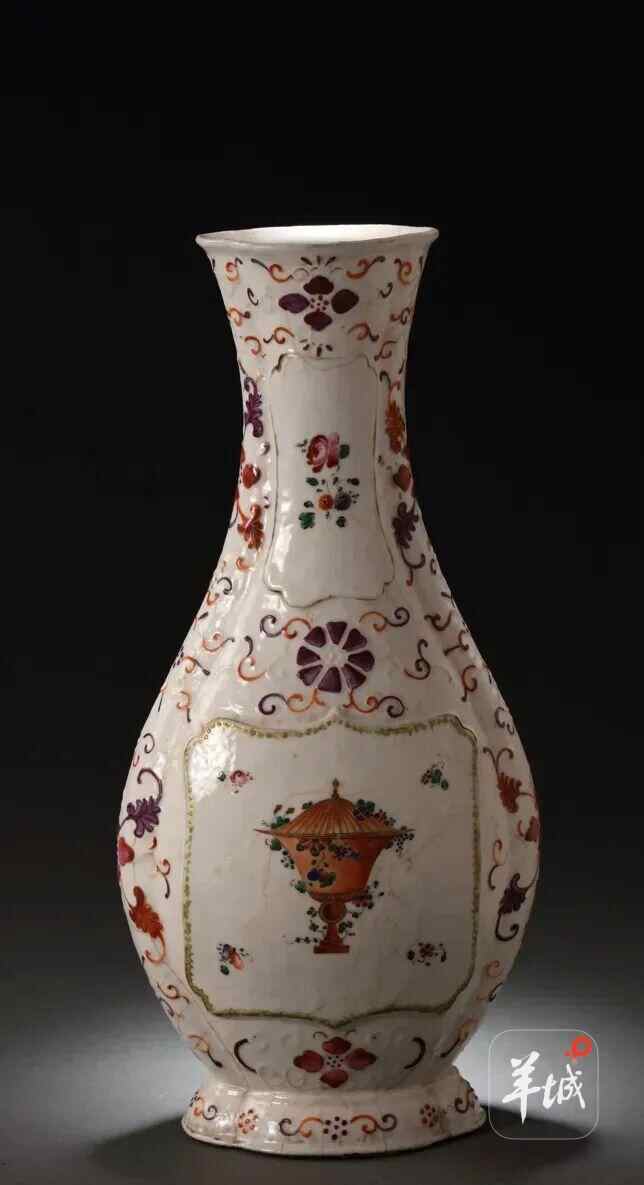 乾隆广彩浆胎花卉奖杯纹瓜棱扁瓶处处透着“洛可可”风格的精致,大量的优雅曲线与贝壳状纹饰,迎合了18世纪欧洲的审美潮流。同时,这类瓷器还常常融合中国传统的花鸟纹、岭南风物元素等,形成了“中西合璧”的独特气质。