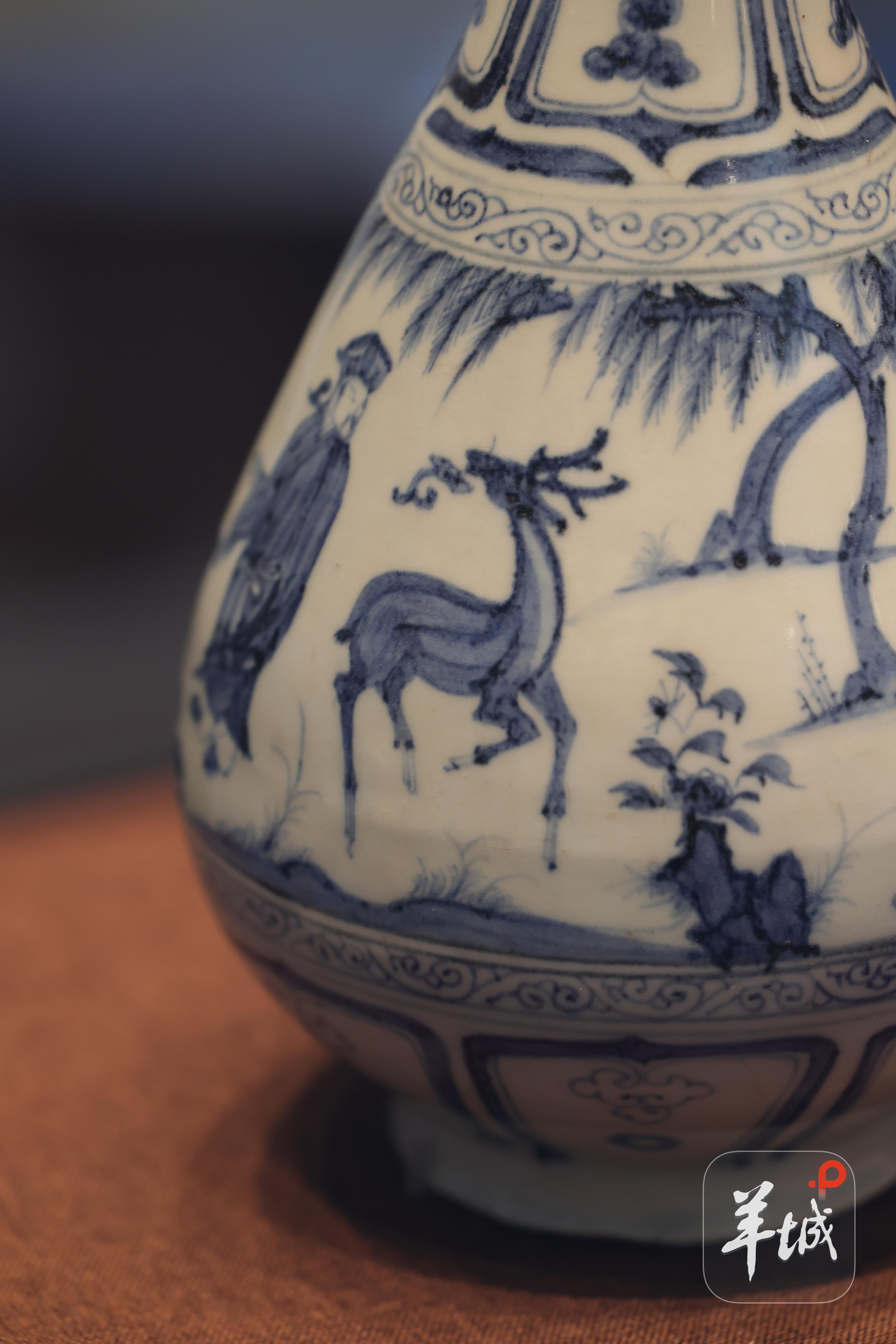 在展厅中间,广东省博物馆的镇馆之宝元代青花人物图玉壶春瓶被放在独立的专门展柜中,瓶身上看似传统的器型与纹饰,却藏着跨文明融合的密码。