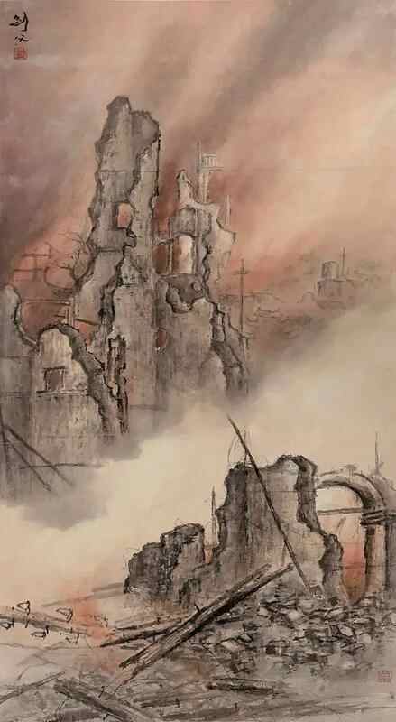画笔,在乱世中不仅是审美的工具,更是投枪,是呐喊。高剑父以艺术为武器,组织了轰动一时的“春睡画院师生抗战义展”。展厅中央,悬挂着他的呕心沥血之作——《东战场的烈焰》。画面以传统水墨的磅礴气势,再现了上海闸北被日寇轰炸后的惨烈景象。画面一角,题着他蘸满血泪的诗句:“国破山河在,春深草木悲。”这画、这字,凝聚着山河破碎的悲愤与不屈的斗志,直击人心。