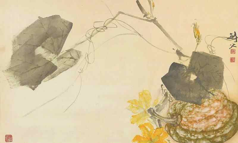 1940年创作的《南瓜图》,便是这一时期的艺术结晶。画面上,饱满的南瓜浑圆厚实,瓜叶的向背、翻转,并不依赖刻板的勾勒,而是通过水与墨、水与色的自然渗透、冲撞、交融,在宣纸上形成极其微妙的光影过渡和体积感。那藤蔓的走势,则饱含金石篆籀的笔意,遒劲有力,如龙蛇游走,于恣肆中见法度,在酣畅处显精神。