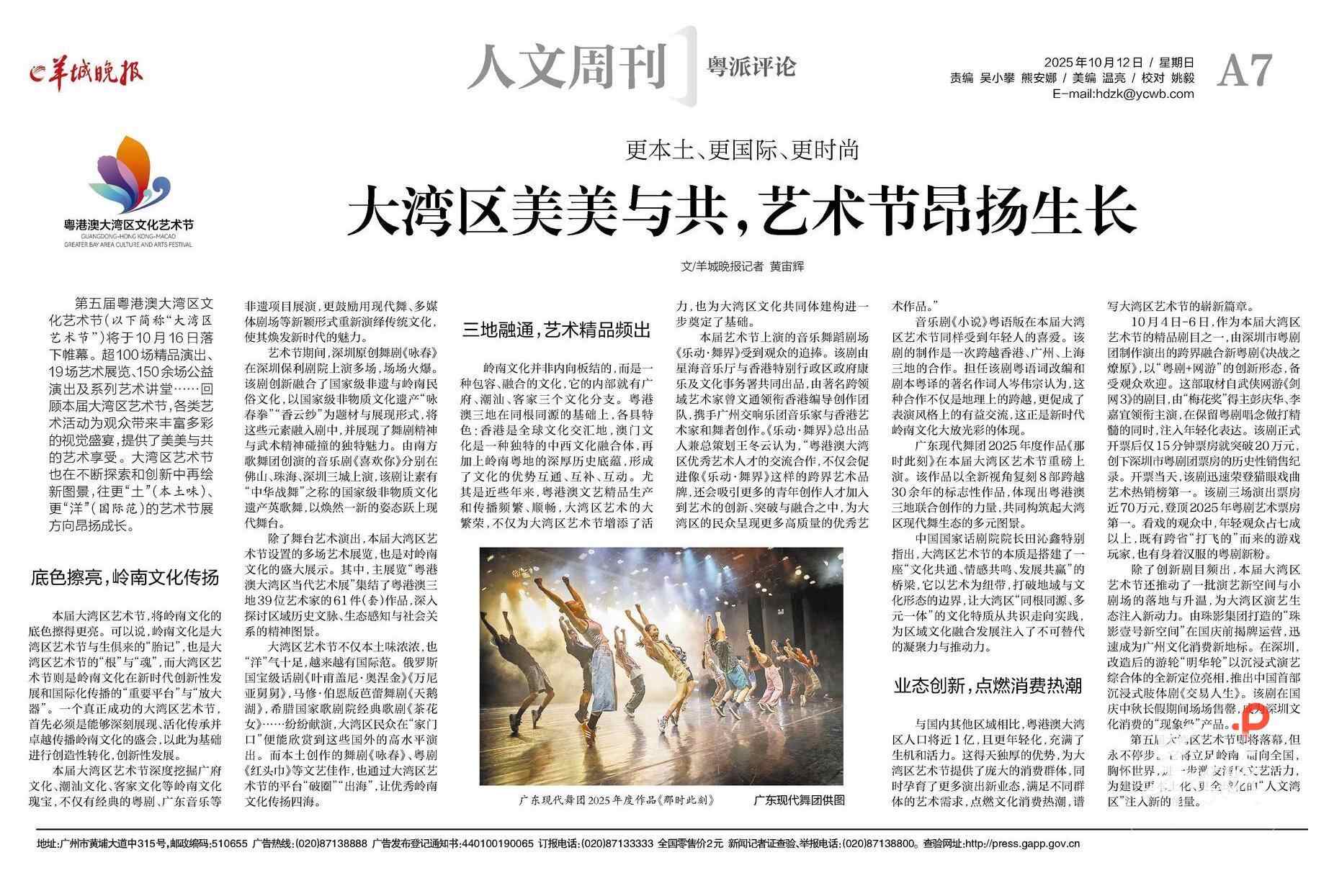 第五届粤港澳大湾区文化艺术节(以下简称“大湾区艺术节”)将于10月16日落下帷幕。超100场精品演出、19场艺术展览、150余场公益演出及系列艺术讲堂……回顾本届大湾区艺术节,各类艺术活动为观众带来丰富多彩的视觉盛宴,提供了美美与共的艺术享受。大湾区艺术节也在不断探索和创新中再绘新图景,往更“土”(本土味)、更“洋”(国际范)的艺术节展方向昂扬成长。