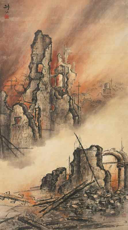 1932年初,“一·二八事变”在上海爆发,高剑父位于大德里弄底的寓所为日军流弹炸毁。他匆匆结束印度行程经广州到上海处理善后,随后以淞沪抗战为题,创作出中国美术史上首件战争废墟主题巨作——《东战场的烈焰》。