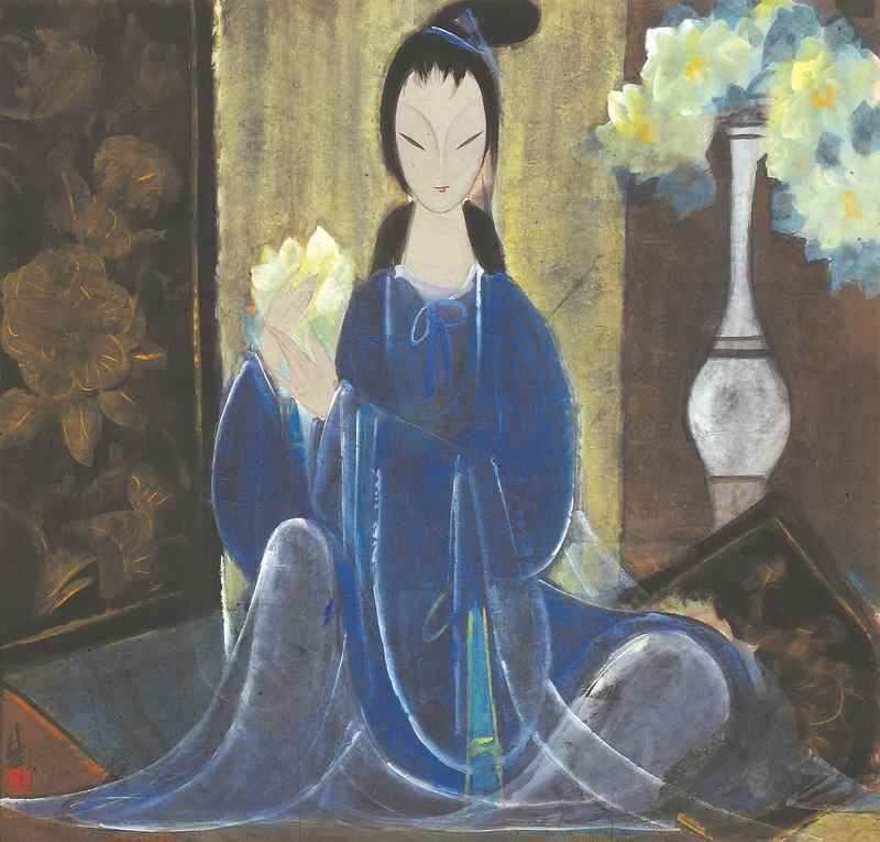 将在“其命惟新——广东美术百年大展”中亮相的《青衣仕女》,正是林风眠在20世纪60年代以来的作品风格趋于成熟的突出体现。林风眠运用了重彩技法,深邃暗沉的重色块和锋利流畅的线条相映衬,使画面富有装饰性又充满飘逸感。