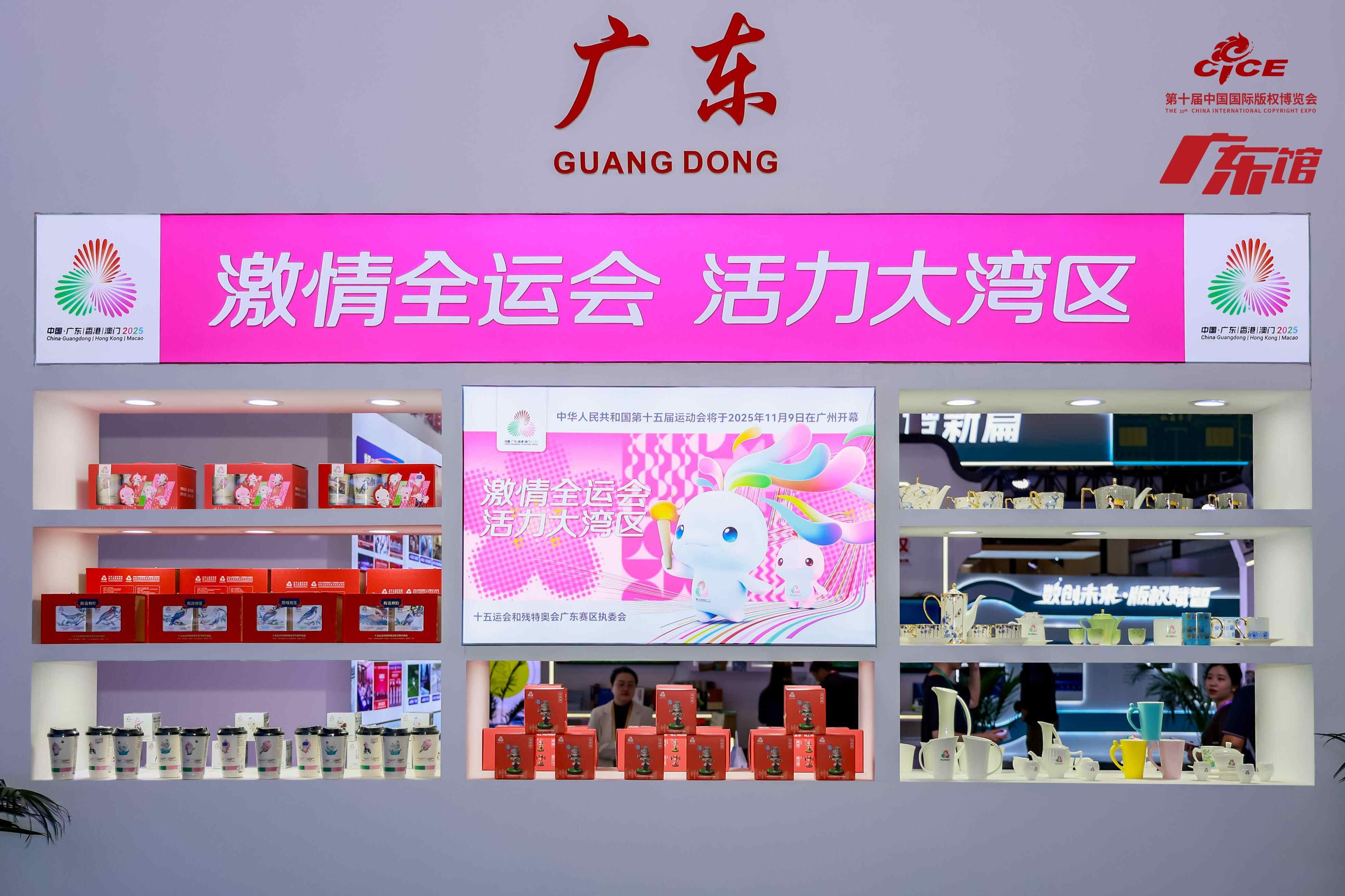 十五运会会歌《气势如虹》首次亮相版博会,为广东展馆的开幕增添气势。“激情全运 广彩书签”“热血十五运 战舞手办”……现场展示的这些特许商品,以十五运会和残特奥会标志形象为核心,充分体现了“体育+岭南文化”“体育+乡村振兴”“体育+非遗”“体育+科技”的创新融合。