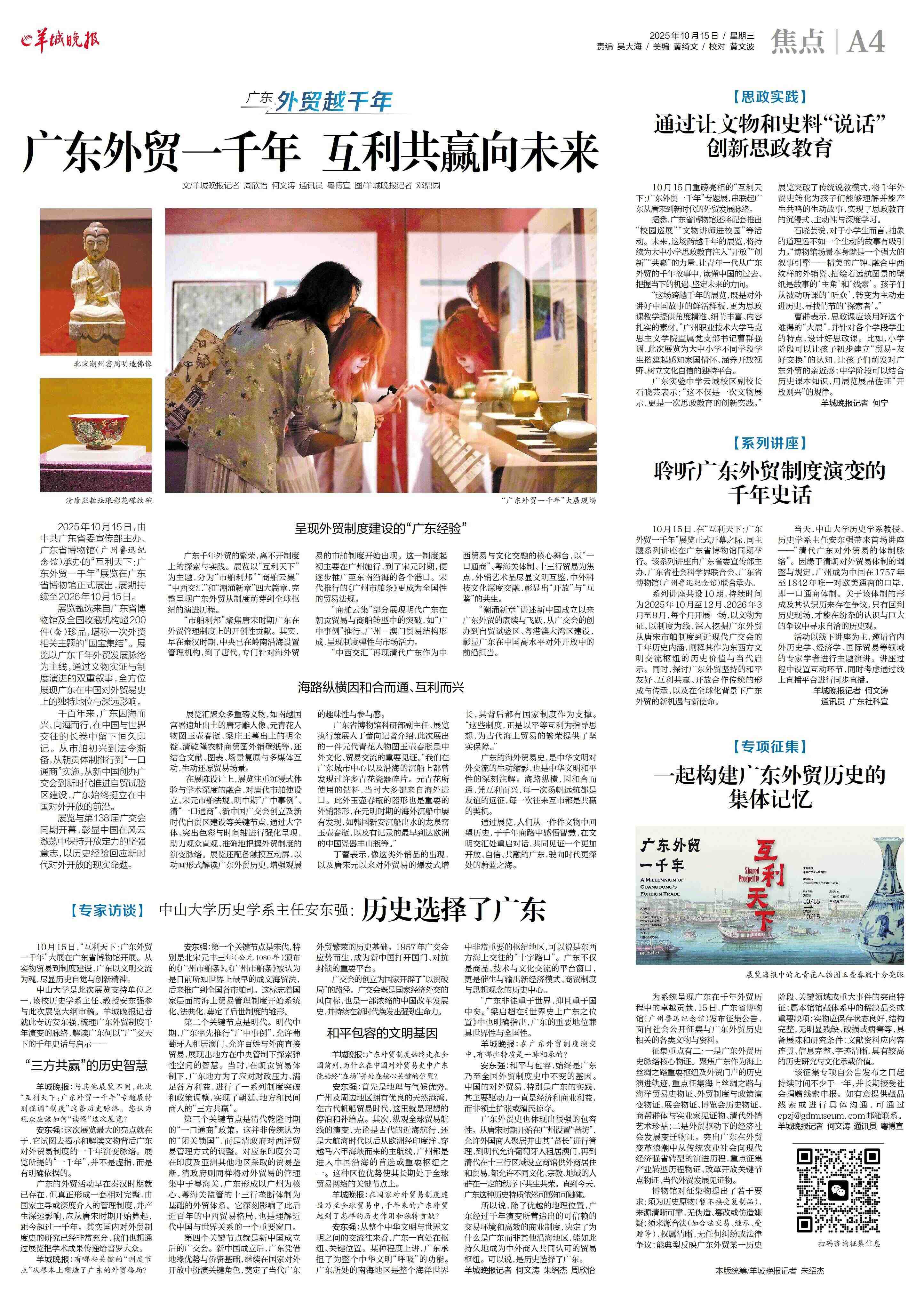 据悉,广东省博物馆还将配套推出“校园巡展”“文物讲师进校园”等活动。未来,这场跨越千年的展览,将持续为大中小学思政教育注入“开放”“创新”“共赢”的力量,让青年一代从广东外贸的千年故事中,读懂中国的过去、把握当下的机遇、坚定未来的方向。