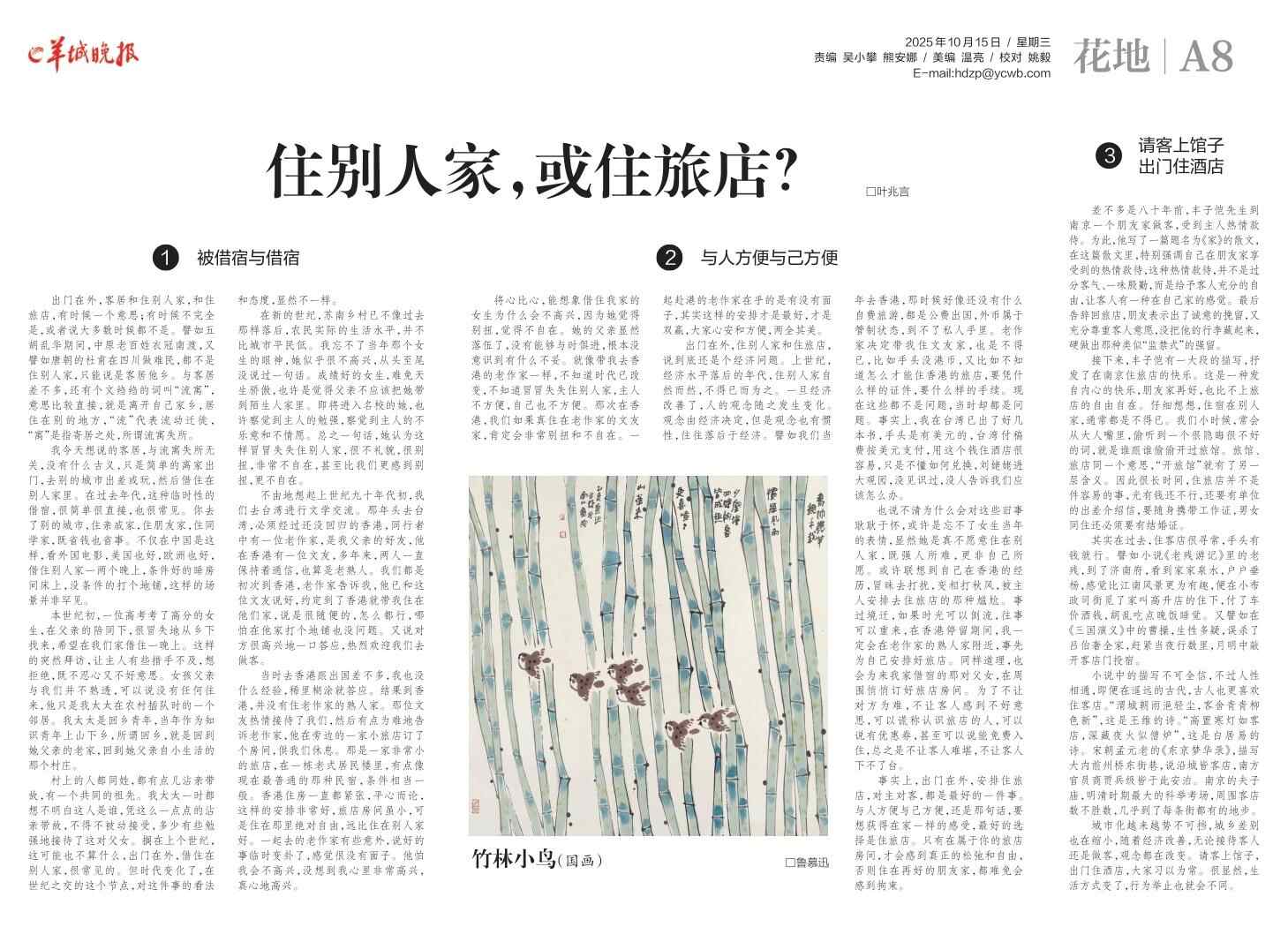将心比心,能想象借住我家的女生为什么会不高兴,因为她觉得别扭,觉得不自在。她的父亲显然落伍了,没有能够与时俱进,根本没意识到有什么不妥。就像带我去香港的老作家一样,不知道时代已改变,不知道冒冒失失住别人家,主人不方便,自己也不方便。那次在香港,我们如果真住在老作家的文友家,肯定会非常别扭和不自在。一起赴港的老作家在乎的是有没有面子,其实这样的安排才是最好,才是双赢,大家心安和方便,两全其美。