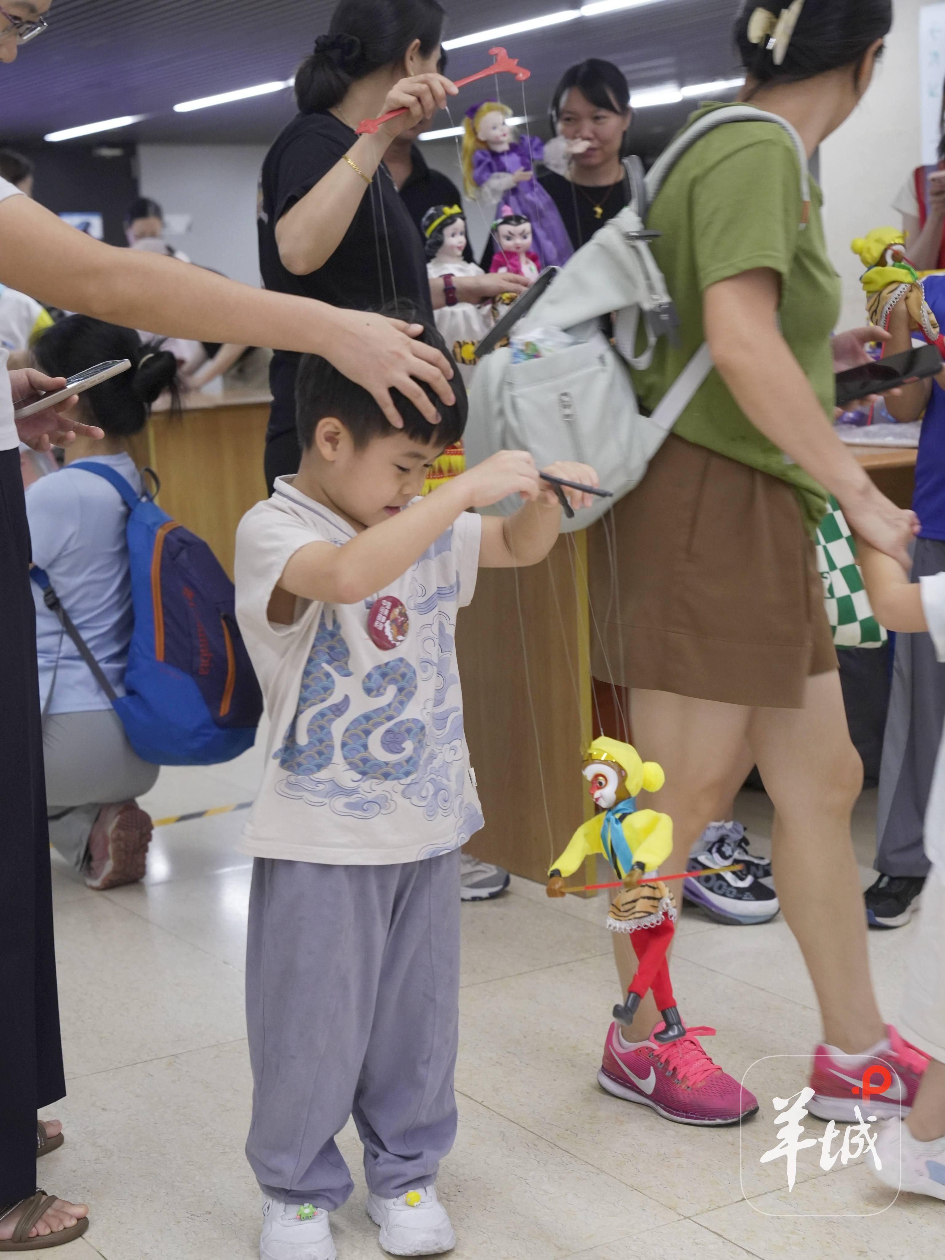 在广图大堂的玻璃展柜中,精美的原创手工书作品和木偶艺术品同步展出,打破了“台上演,台下看”的传统模式,引导孩子们以多元的方式感受阅读之乐、非遗之美。